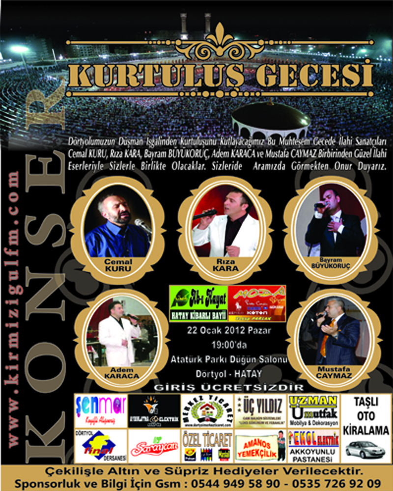 Kırmızıgül İlahi Fm’in Hatay Dörtyol’da 9 Ocak Dörtyol’umuzun Düşman İşgalinden Kurtuluş Yıl Dönümü Münasebetiyle 22 Ocak 2012 Tarihinde düzenlemiş olduğu Kırmızıgül Kurtuluş Gecesi Konserine Büyük ilk ve katılım gösteren dinleyicilerimize şükranlarımızı sunuyoruz…