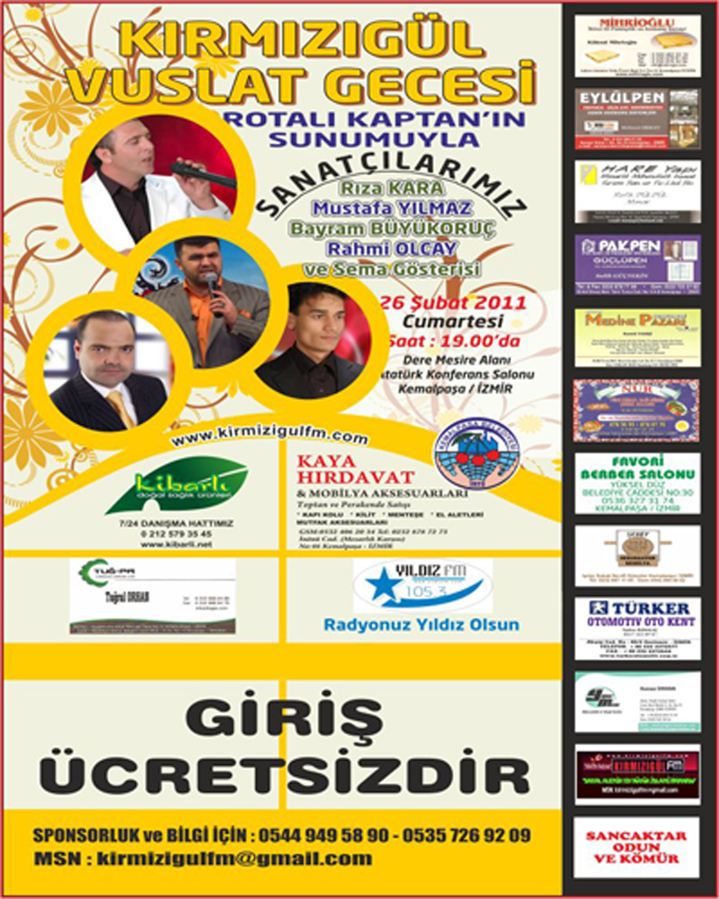 Kırmızıgül İlahi Fm’in İzmir Kemalpaşa’da 26 Şubat 2011 Tarihinde Düzenlemiş Olduğu Kırmızıgül Vuslat Gecesi Konserine Büyük İlgi ve Katılım Gösteren Dinleyicilerimize Şükranlarımızı Sunuyoruz…